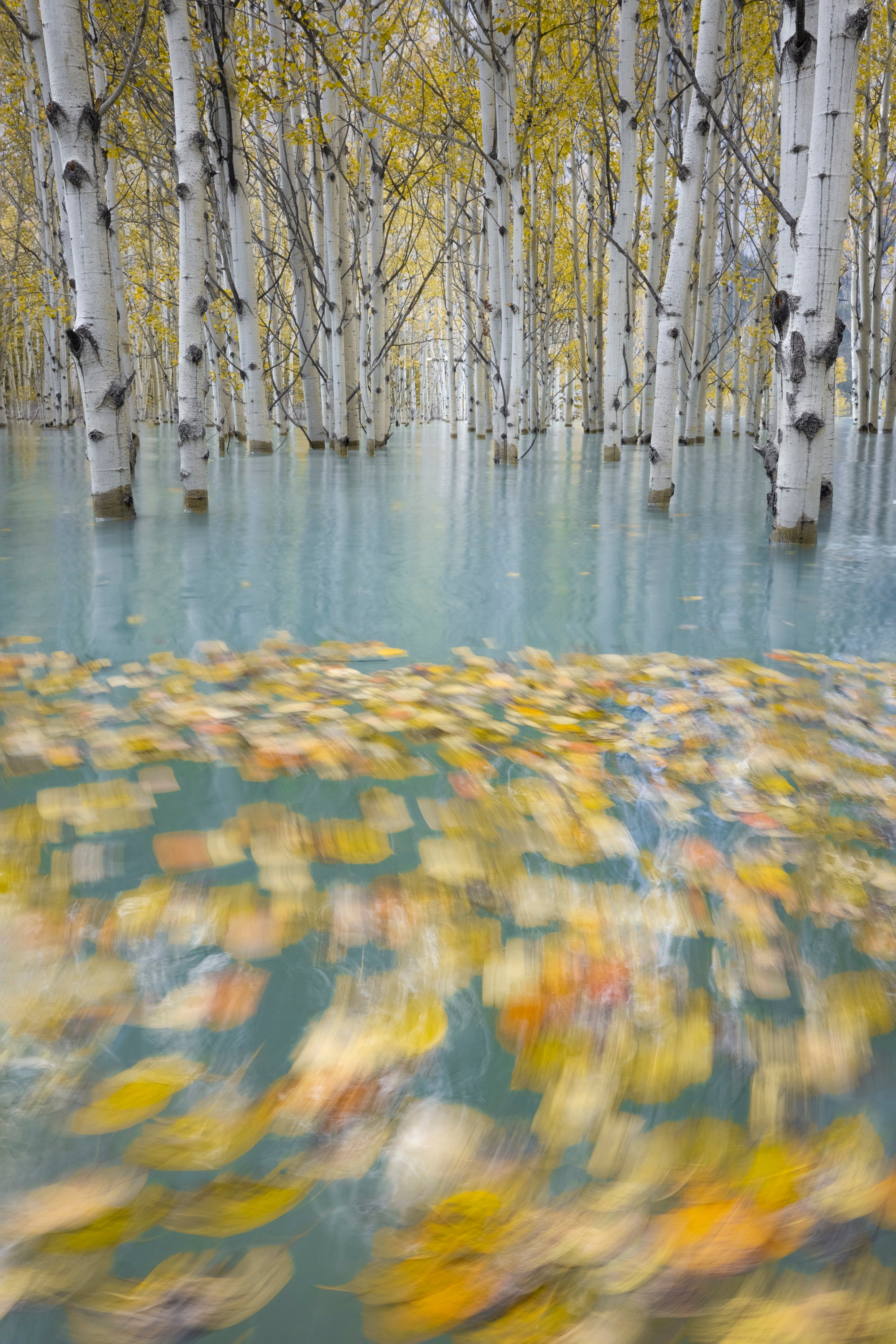 Submerged trees and autumn leaves at Abraham Lake, Canadian Rockies.
