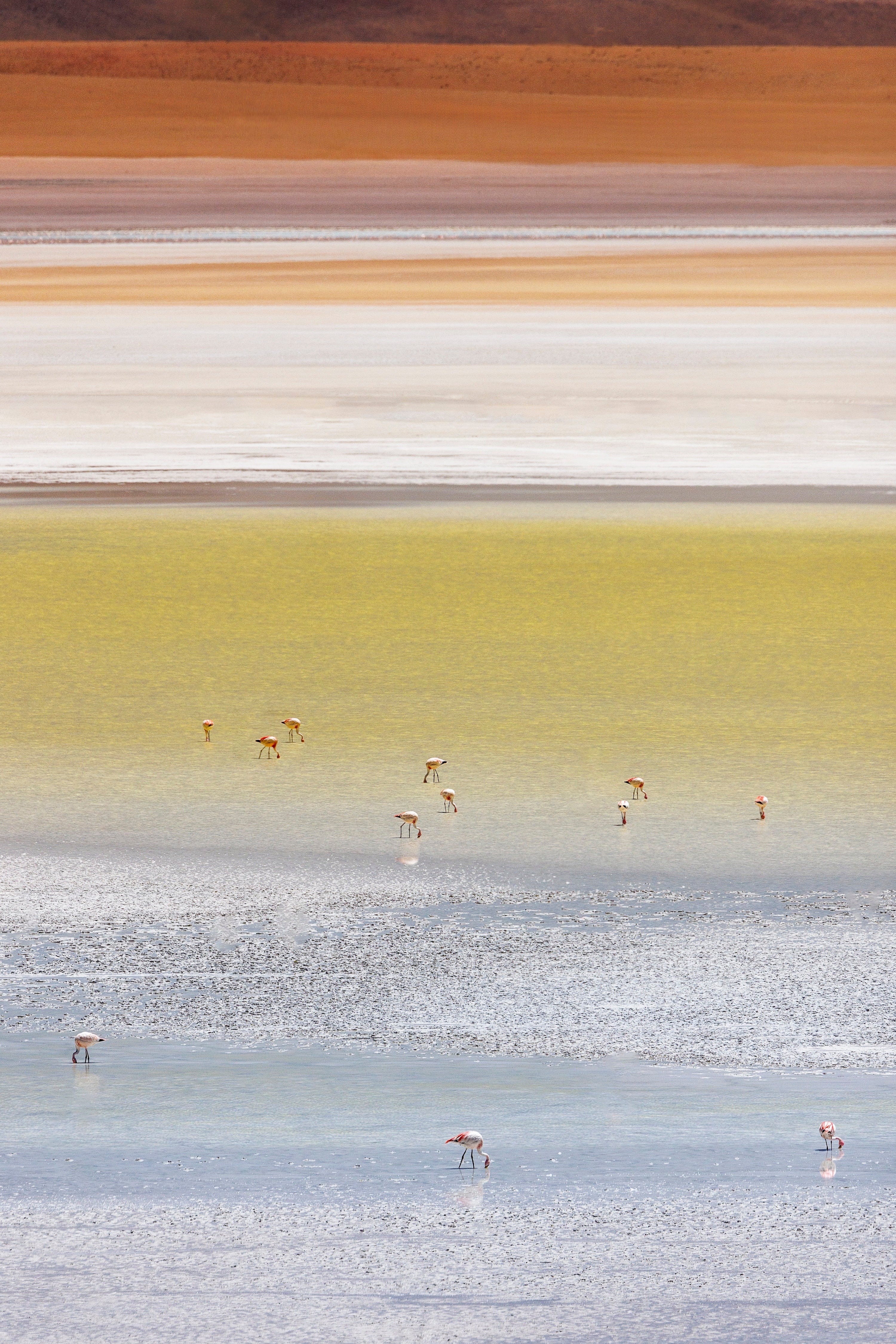 Flamingoes flock to a laguna on the Bolivian altiplano amidst a palette of yellow-orange hues.