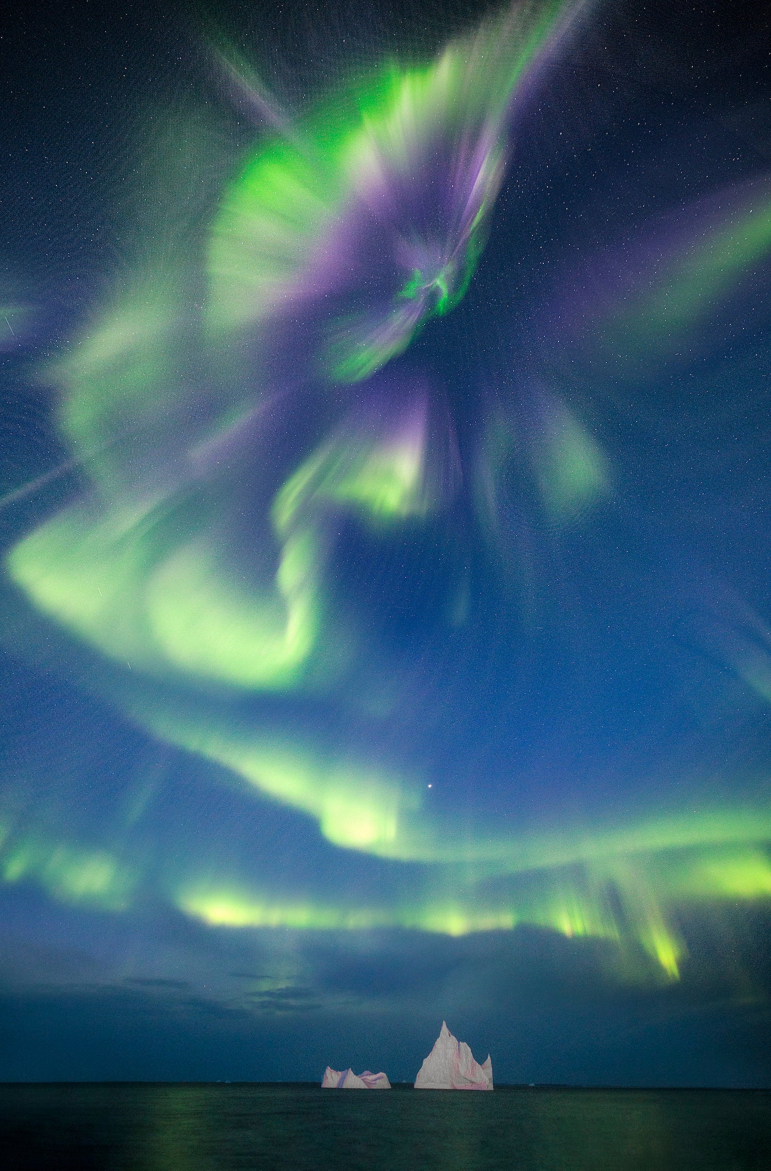 Icebergs and Northern Lights at Disko Bay, Greenland.