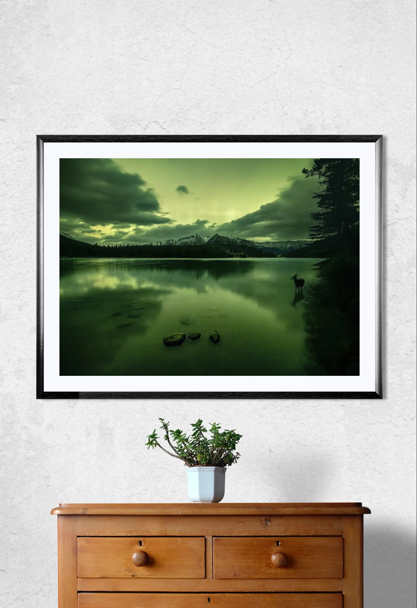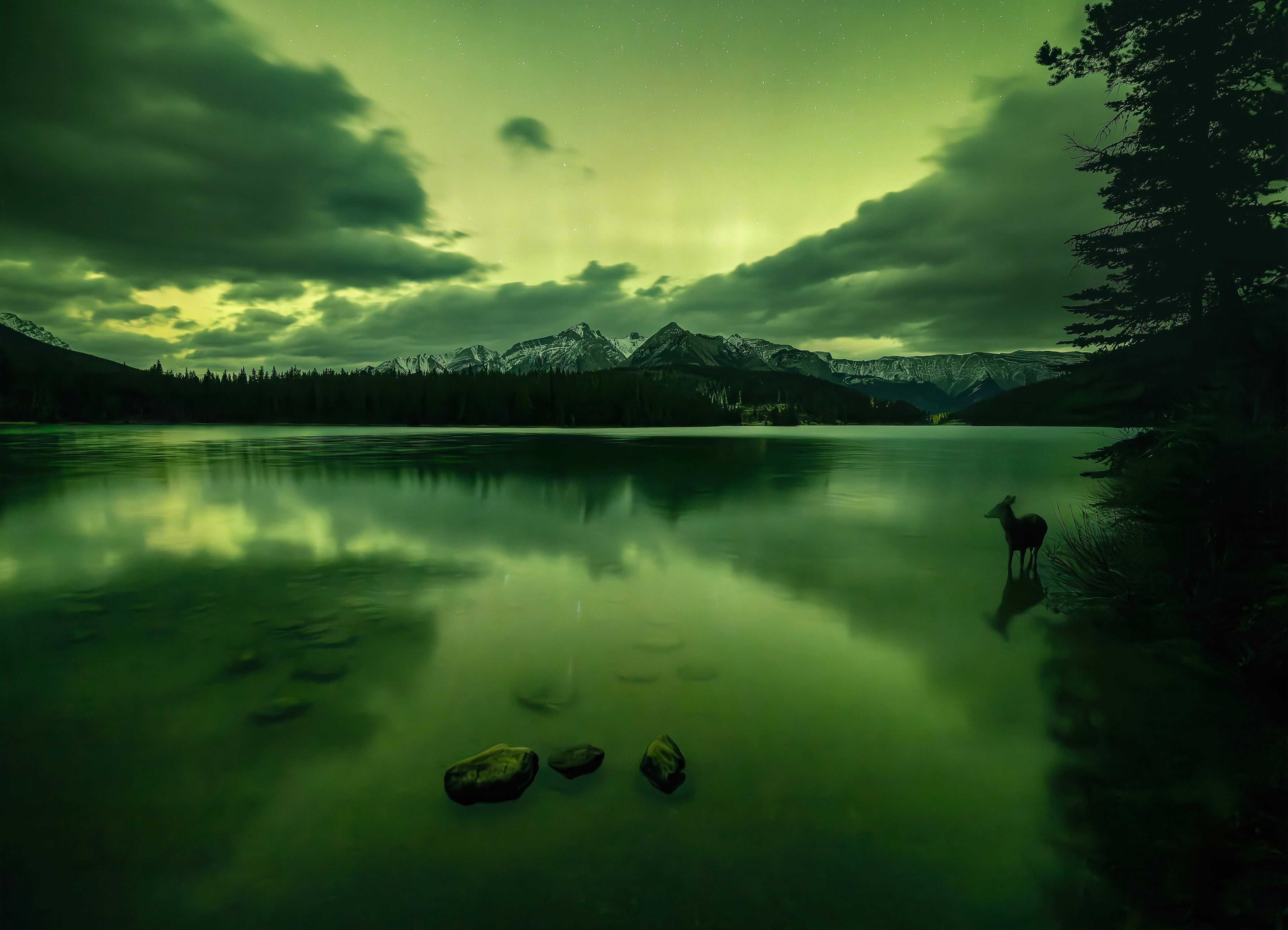 A deer walks through the waters of Two Jack Lake, Banff National Park, and bears witness to a stunning display of northern lights.