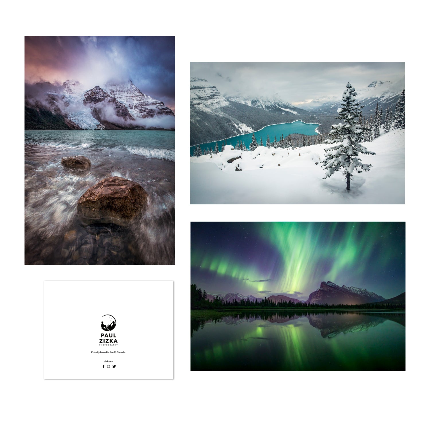Featuring stunning Canadian Rockies photos by Paul Zizka! These greeting cards come blank inside with Paul Zizka branding and information on the back. Choose from holiday-themed or all-season images.